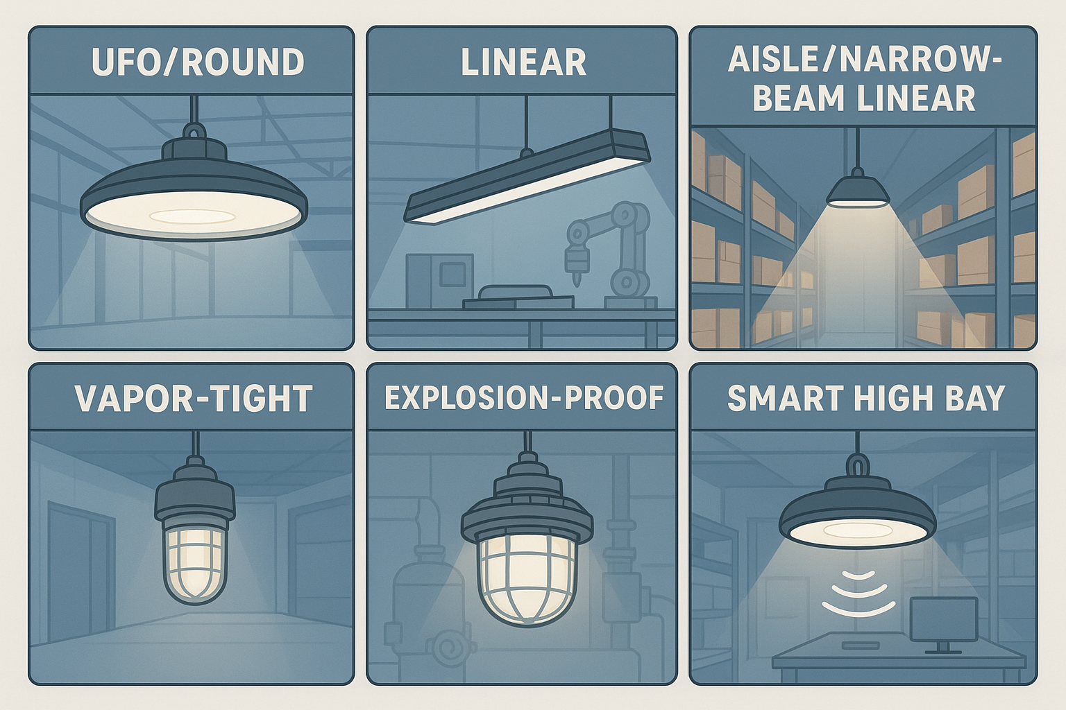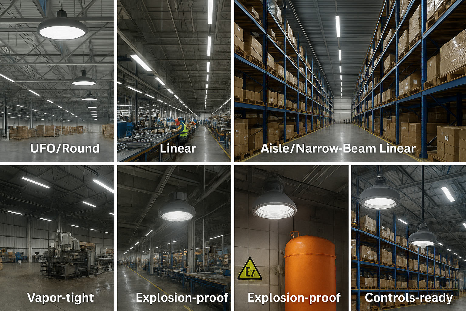Match a type family: UFO/round for open bays; linear for rectangular lines; narrow-beam aisle fixtures for racks; vapor-tight for wet/clean; explosion-proof where compliance requires; controls-ready for energy savings.