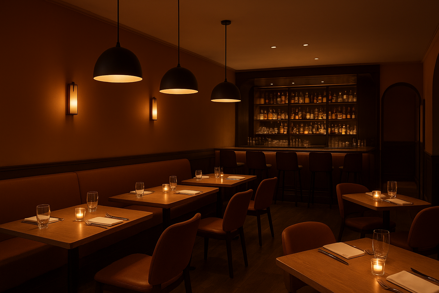 Restaurant: A small pool of uplight over bars lifts ceiling mood without dazzling patrons.