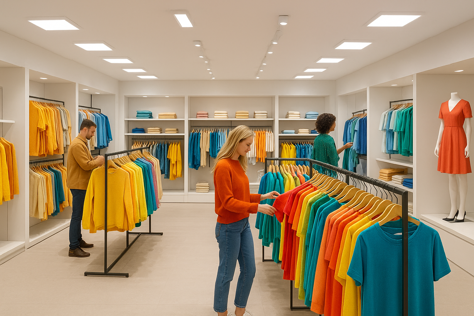 Plan higher illuminance (often 750–1000 lux combined with accent layers). Use CRI ≥ 90 with strong R9 for saturated reds and select CCT 3000–4000 K to align with brand mood. UGR thresholds are commonly ≤ 22 on sales floors; coordinate accent lighting with panels to avoid harsh contrasts.