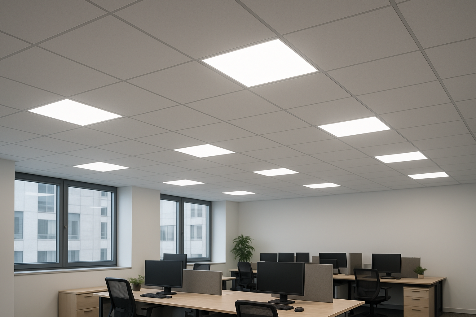 Design toward 500 lux maintained on work planes with UGR ≤ 19, CRI ≥ 80–90, and CCT 4000–5000 K. Keep flicker low per IEEE 1789 guidance to reduce visual fatigue during screen work. Panels with microprisms help control glare in bright, reflective interiors.