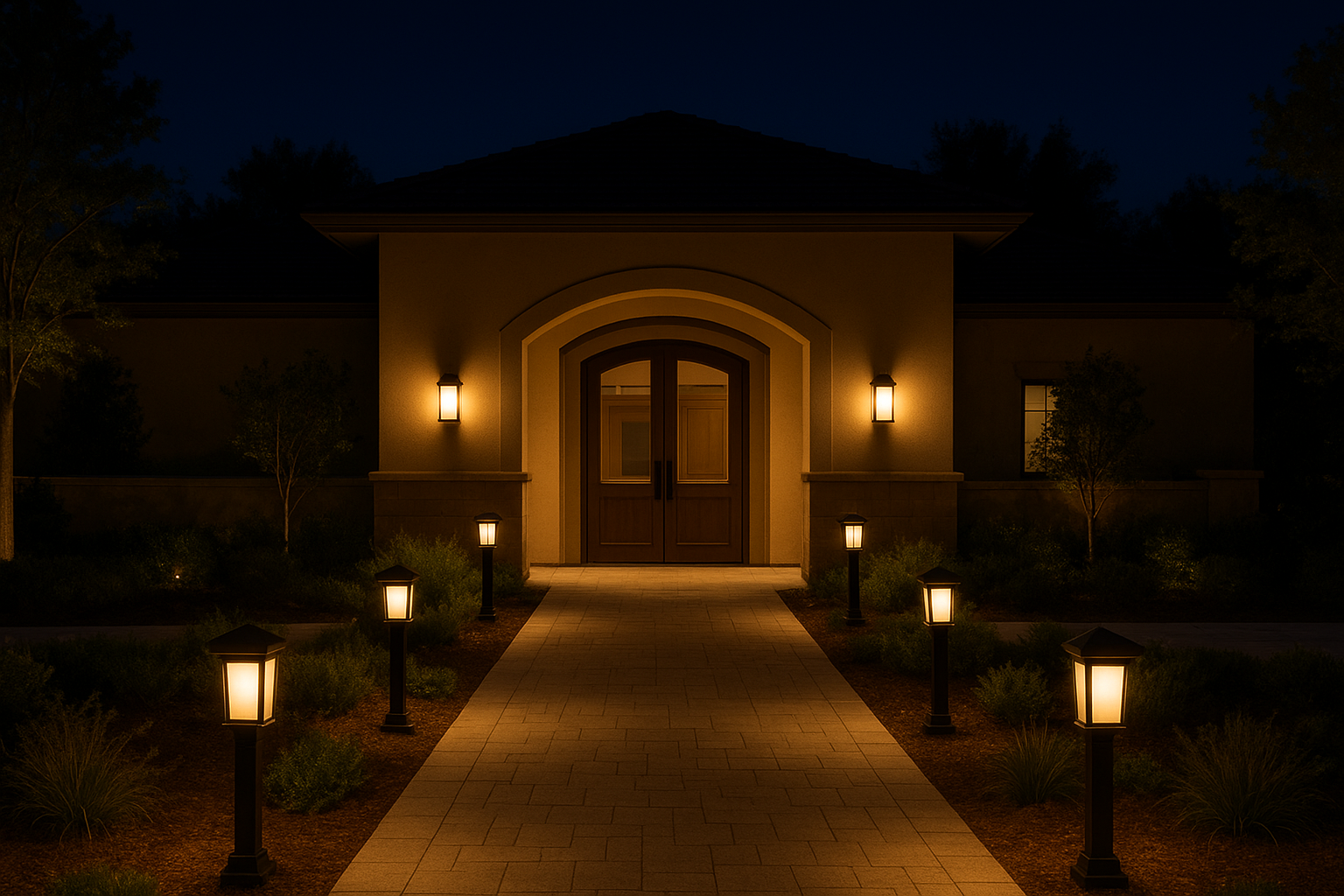 Facades | Linear/flood | 10–20 ft | Full cut-off/visors | 2700–3000K | Timeclock + scenes | IP65–IP66 | Quote-based |