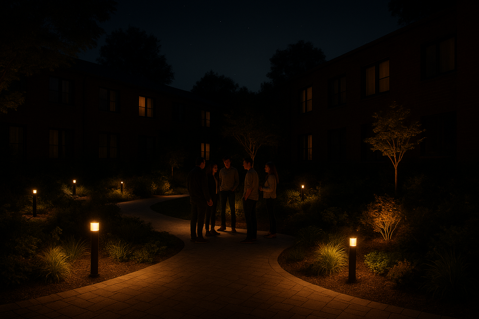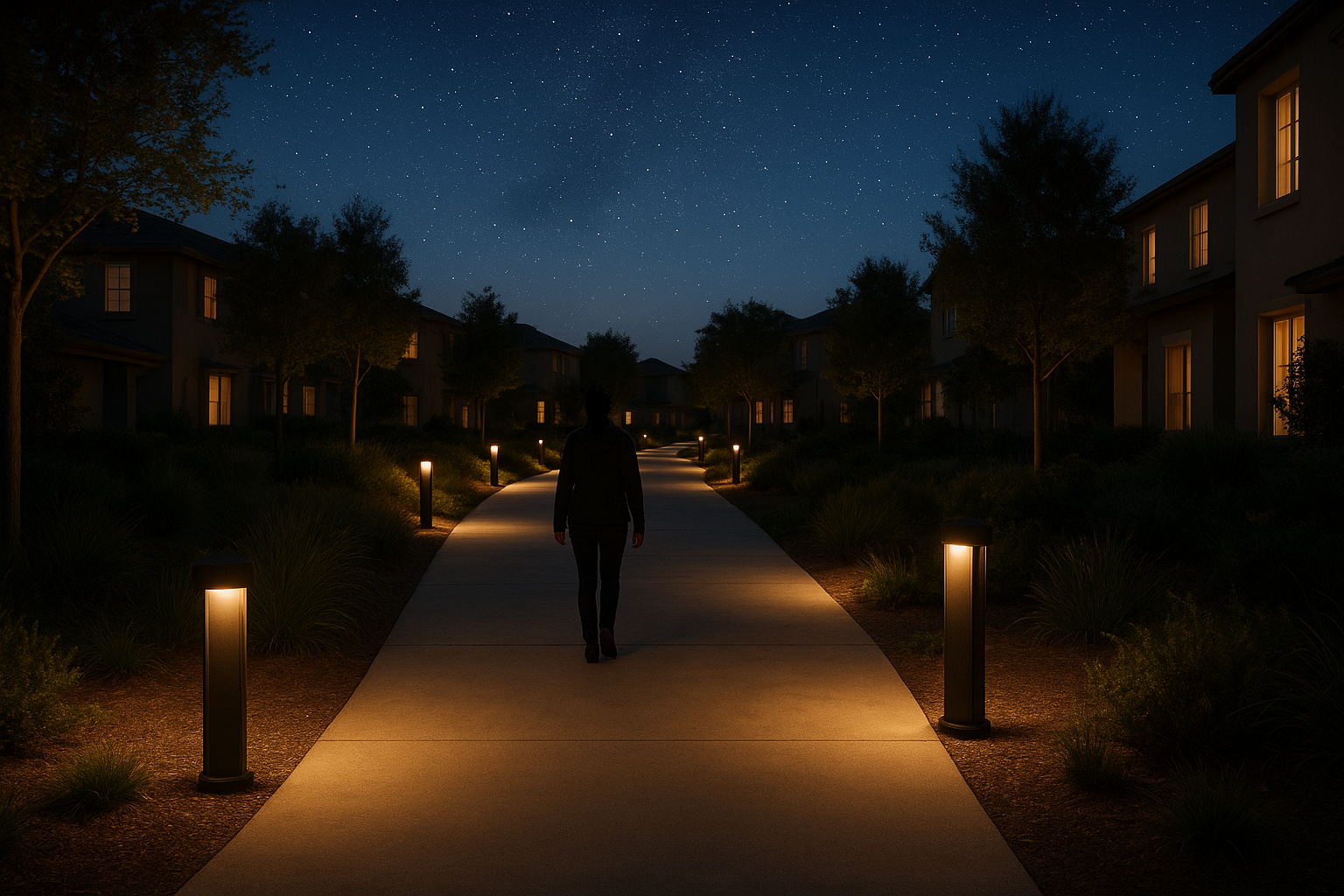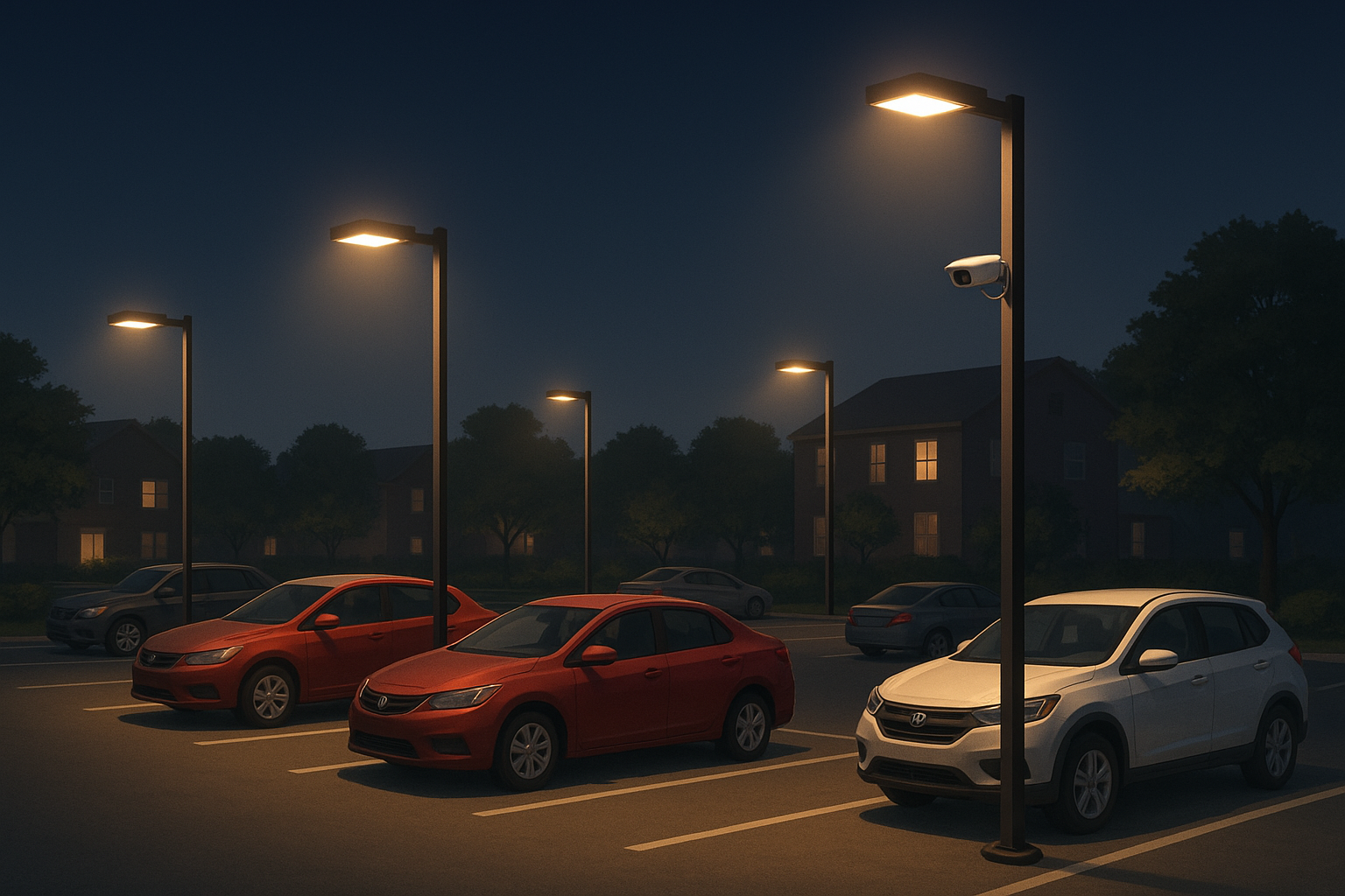Fixtures: pole-mounted area/site lights (Type III/IV/V). Mounting: 20–30 ft. Light quality: 3000–4000K (balance visibility vs. ambiance); full-cutoff optics with low BUG.