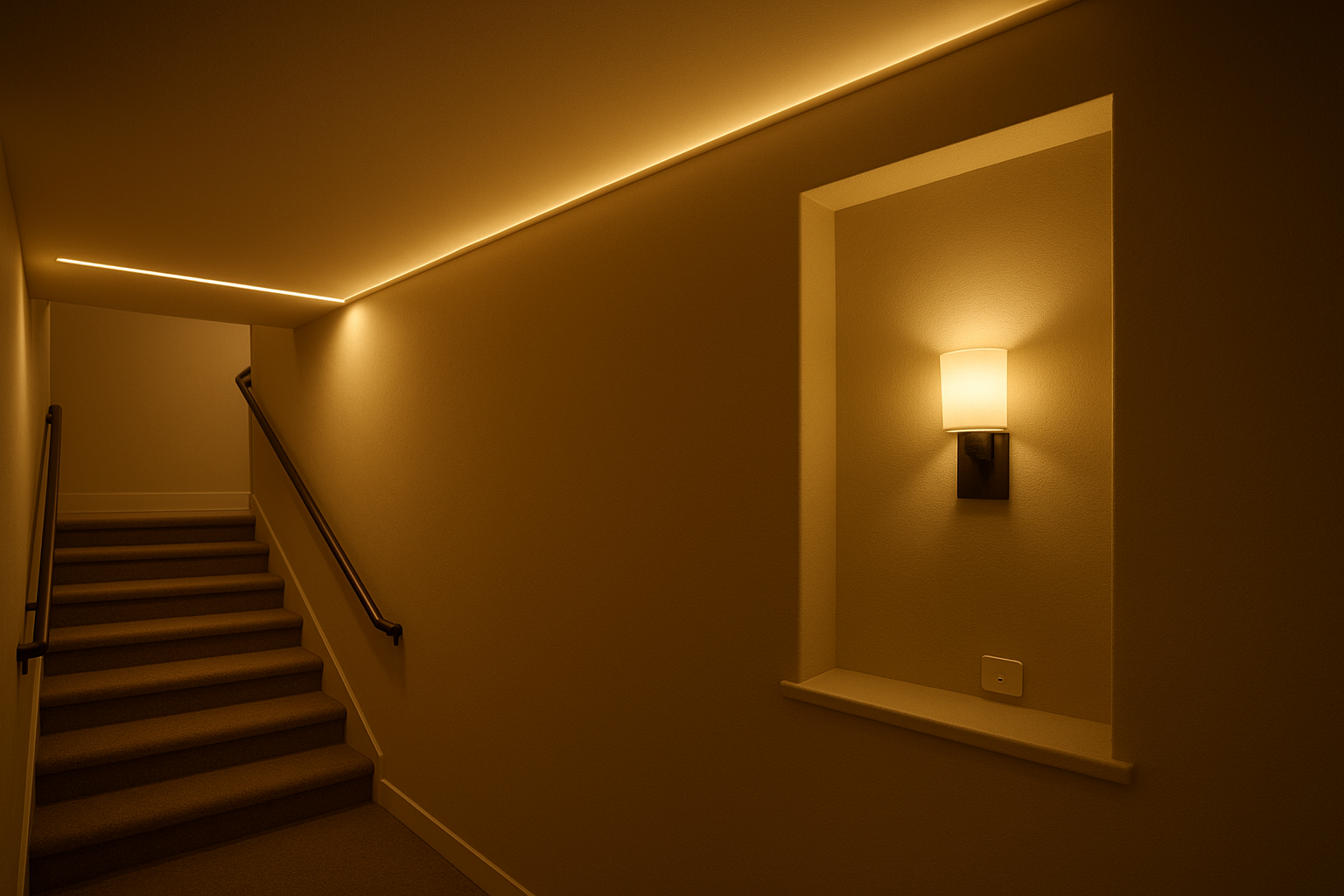 Fixtures: recessed linear or shallow diffused strips; wall sconces in alcoves. Mounting: ceiling or 7–10 ft wall. Light quality: 2700–3500K; diffuse optics to reduce point-source glare.