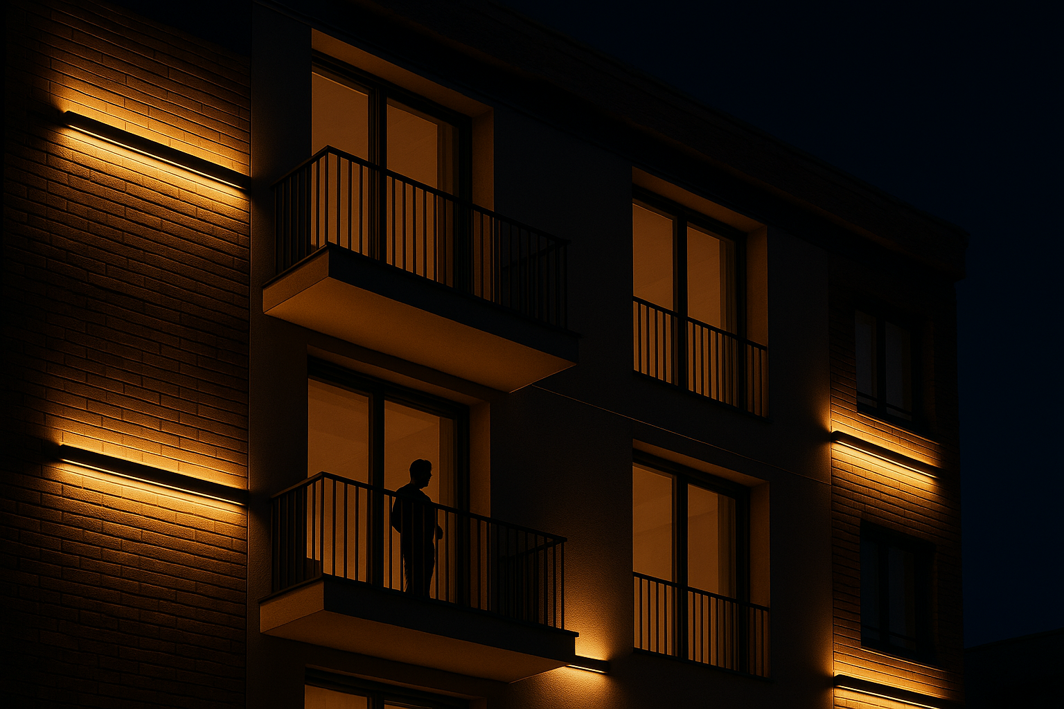 ▍ Purpose: Controlled wall-wash and texture emphasis that preserves neighbor comfort and night-sky goals.