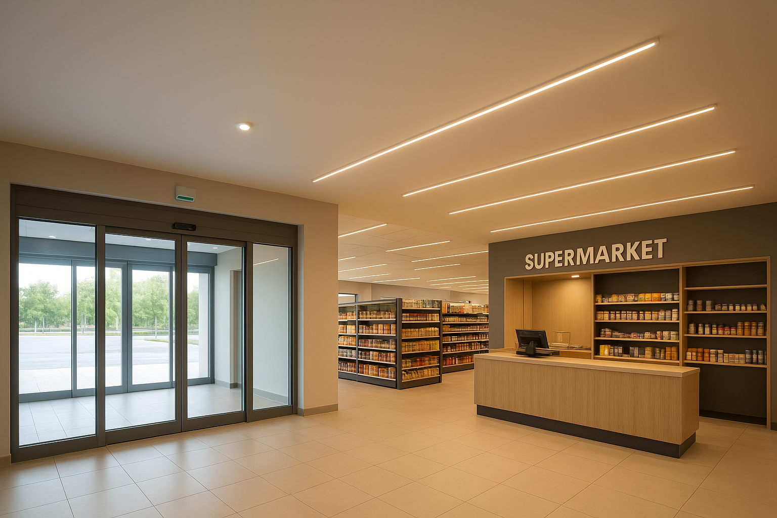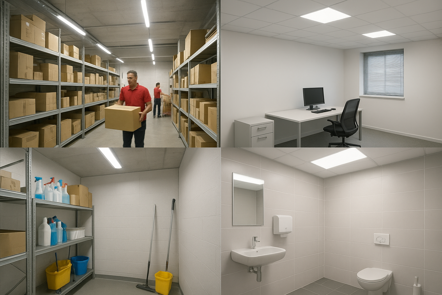 Recommended fixtures: Durable LED battens/strips for stock areas; diffused panels for offices; sealed fixtures in janitorial/restrooms.