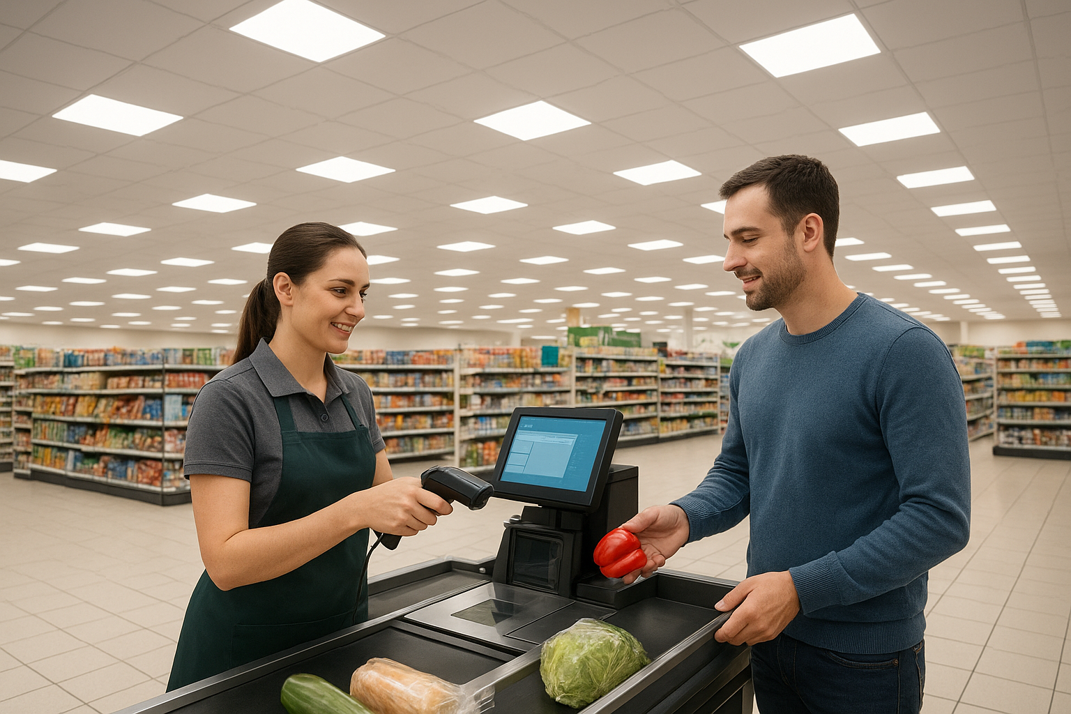 Practical notes: Roughly 70–100 fc (≈750–1080+ lx); about 4000K. Keep UGR low to reduce eye strain at POS; add local task lights only if needed to avoid clutter.