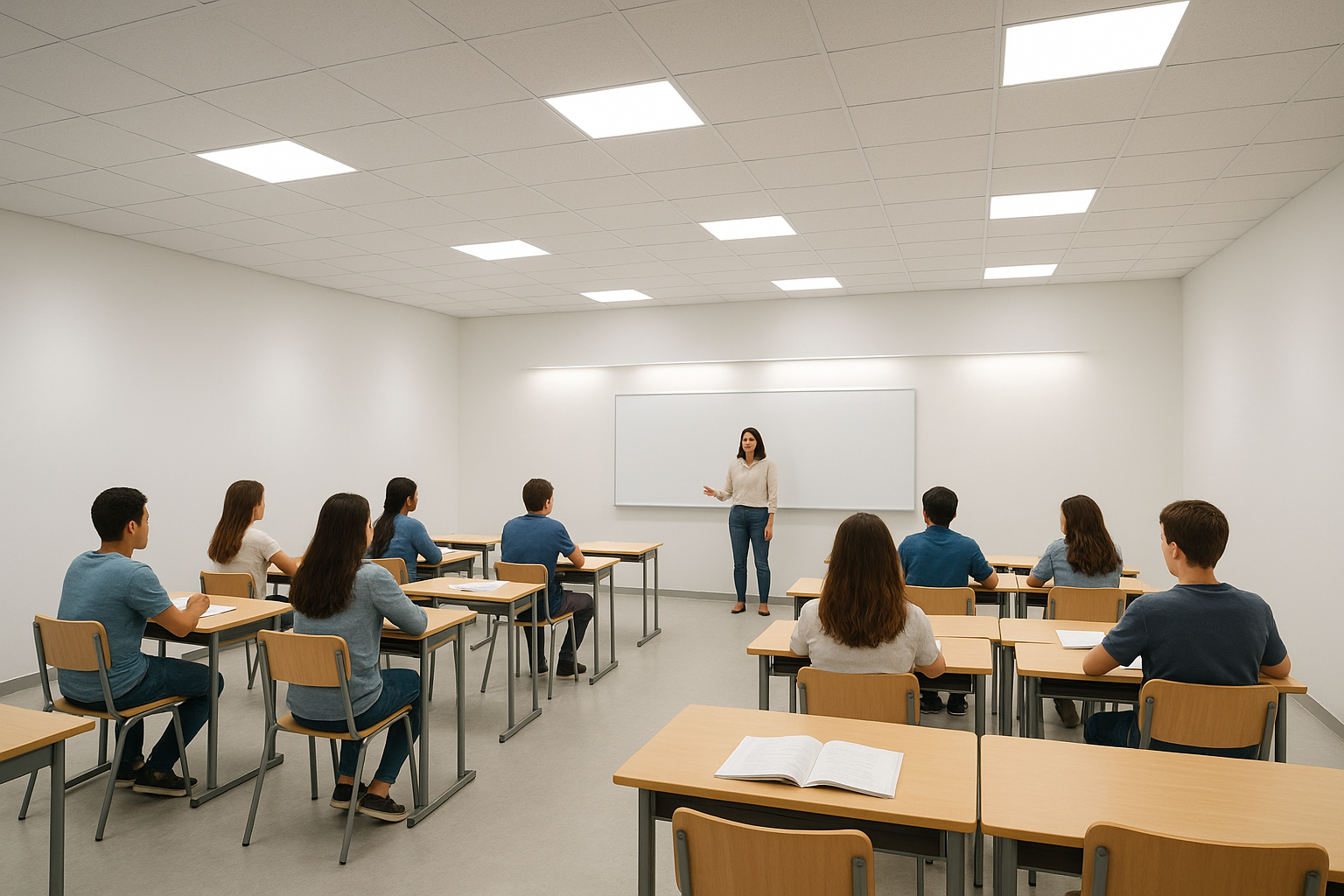 Dual-zone approach. Treat the desk plane and the teaching wall as distinct layers. For the desk plane, keep UGR ≤19 in student sightlines and maintain even horizontal illuminance. For the board, use asymmetric wallwashers mounted a short offset from the wall to achieve uniform vertical lighting without hotspots or teacher glare.