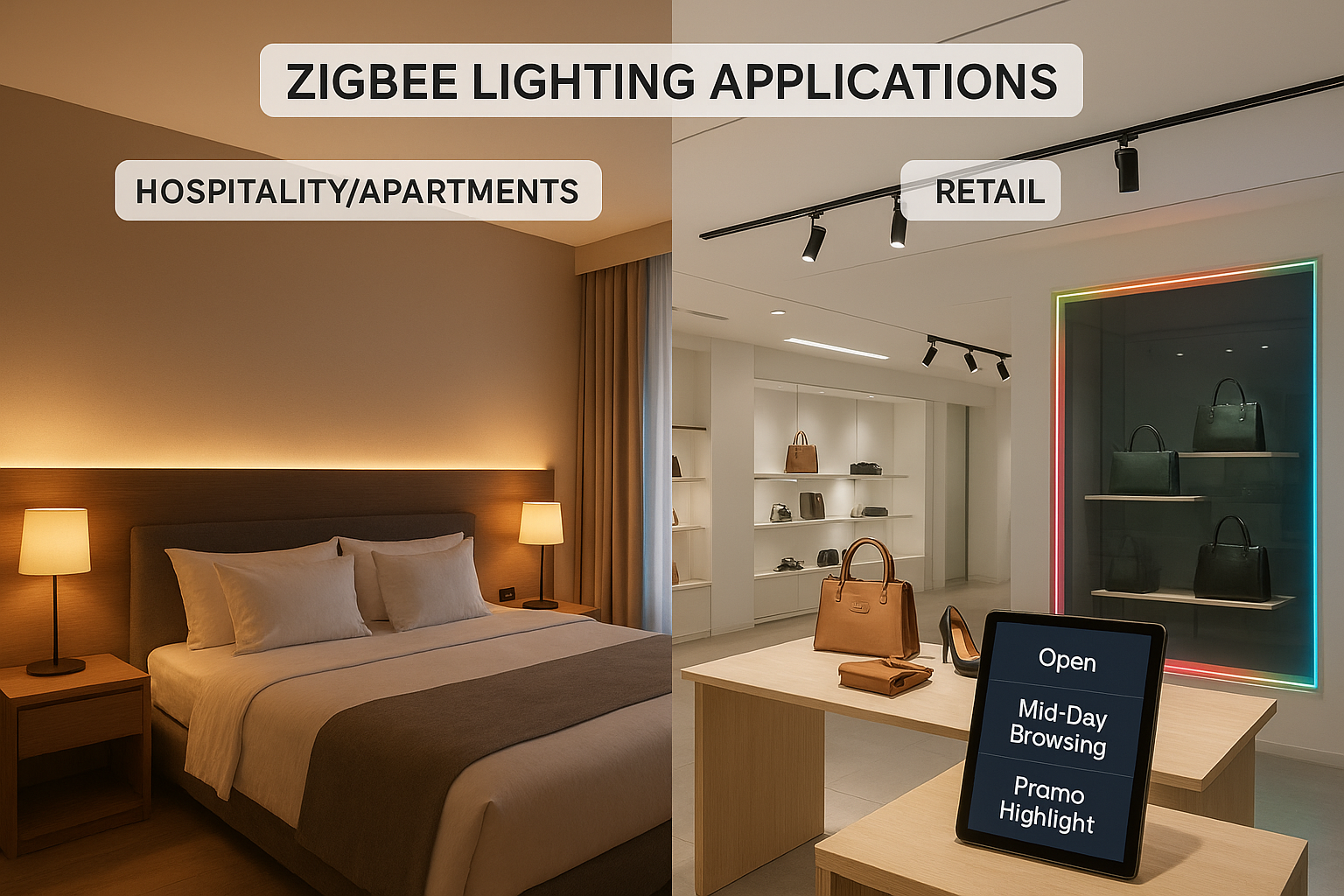 Zigbee groups keep the controls simple for guests and staff: one group for ambient, one for bedside, one for bathroom, and optionally one for balcony or entry. Scenes handle the experience—welcome, relax, reading, night, and housekeeping—so operations teams can align lighting behavior with room status.