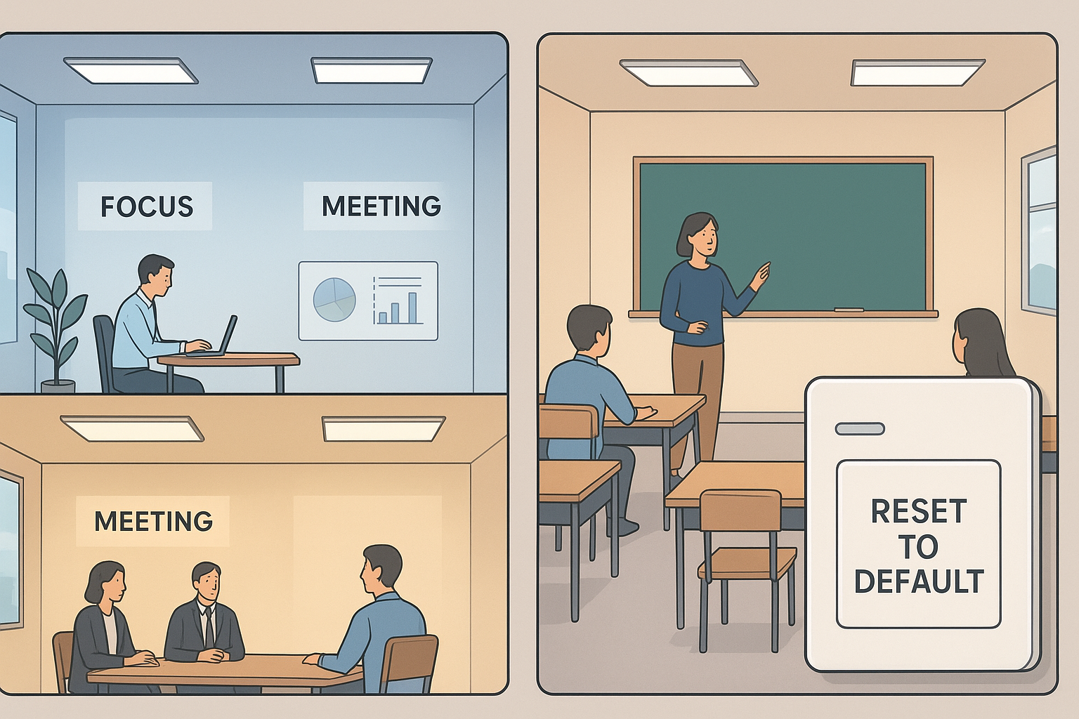 Start with the activities that change lighting needs: focus work, meetings, presentations, and cleaning. Panel lights and linear fixtures typically provide the core ambient layer, with downlights used for corridors, receptions, labs, or smaller rooms.