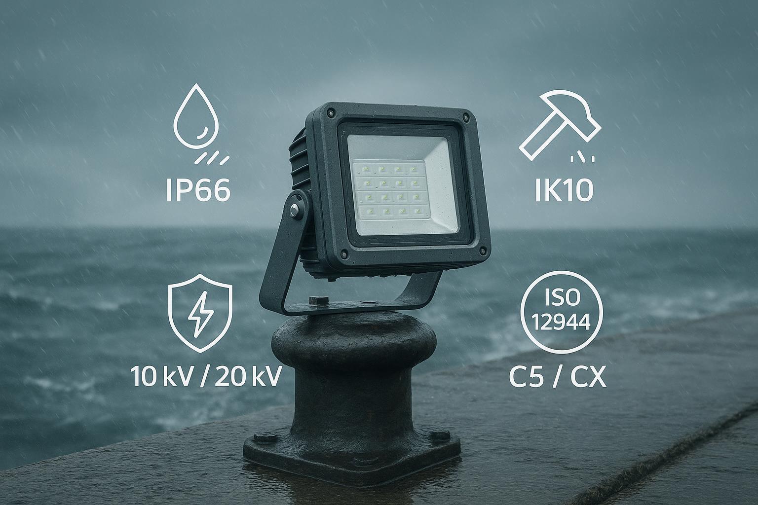 Coastal sites expose luminaires to salt spray, wind-driven rain, abrasive airborne particles, and more frequent electrical transients. This checklist is written for procurement/specification staff and electrical contractors to help choose, specify, install, and maintain IP65/IP66 LED floodlights for coastal and high‑corrosion environments.
