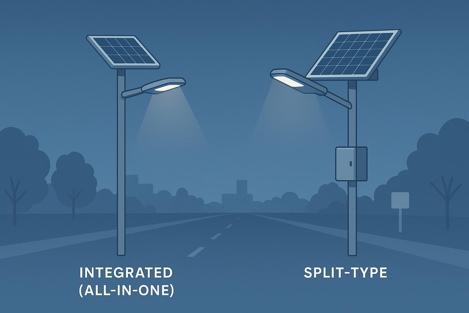 انٹیگریٹڈ (آل ان ون) پینل، LiFePO4 بیٹری، کنٹرولر، اور LED انجن کو ایک کمپیکٹ ہیڈ میں یکجا کرتا ہے۔ اسپلٹ ٹائپ پینل (اور اکثر بیٹری/کنٹرولر) کو luminaire سے الگ کرتی ہے، بڑی صفوں، ایڈجسٹ جھکاؤ، اور تھرمل علیحدگی کو فعال کرتی ہے۔